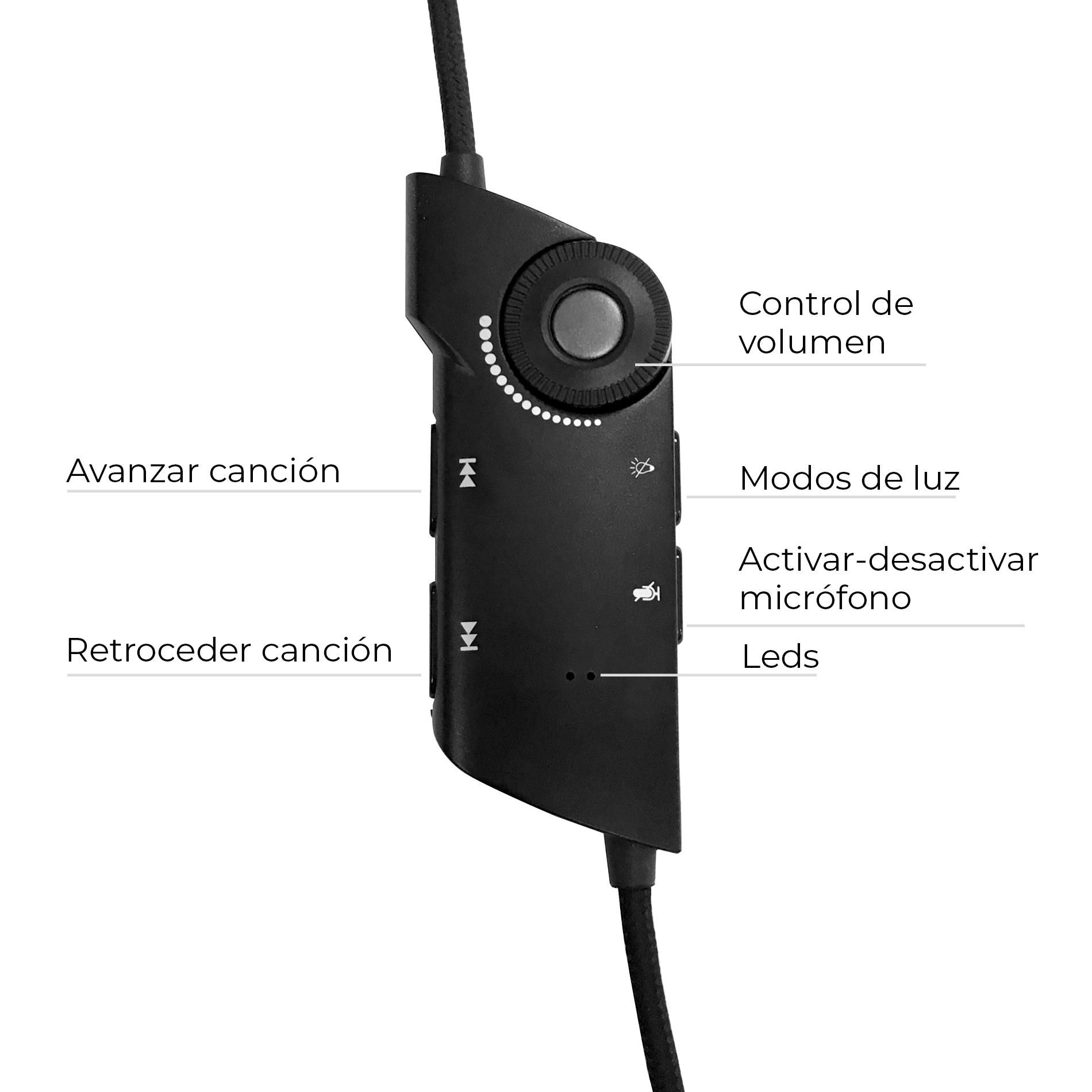 Con un diseño elegante, terminado en color negro y logo con iluminación RGB. Incorpora un controlador en el cable para ajustar cada parámetro del auricular: silenciar micrófono, subir y bajar volumen o cambiar los efectos de luz.